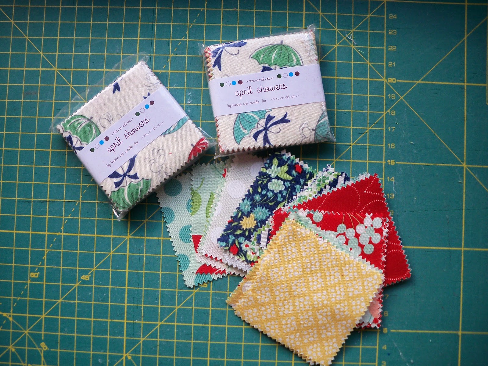 ¿Y la última foto? Tres mini charm packs que gané en el sorteo organizado por Sew Mama Sew y en el que participan un montón de blogueros de todo el mundo. Mis telitas llegaron directamente desde Singapur, y son de la colección April Showers de Bonnie and Camille para Moda. Ahora necesito decidirme a hacer algo con ellas.